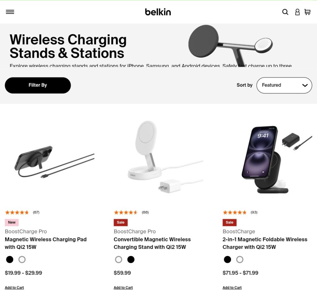 Belkin’s product lineup also includes cables for phones, MagSafe docks, switch accessories, smart home devices (like WeMo), KVMs, audio equipment, and enterprise charging solutions.