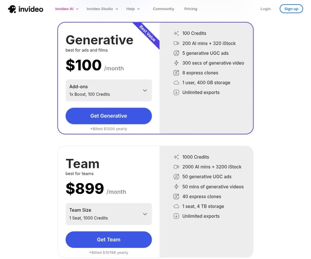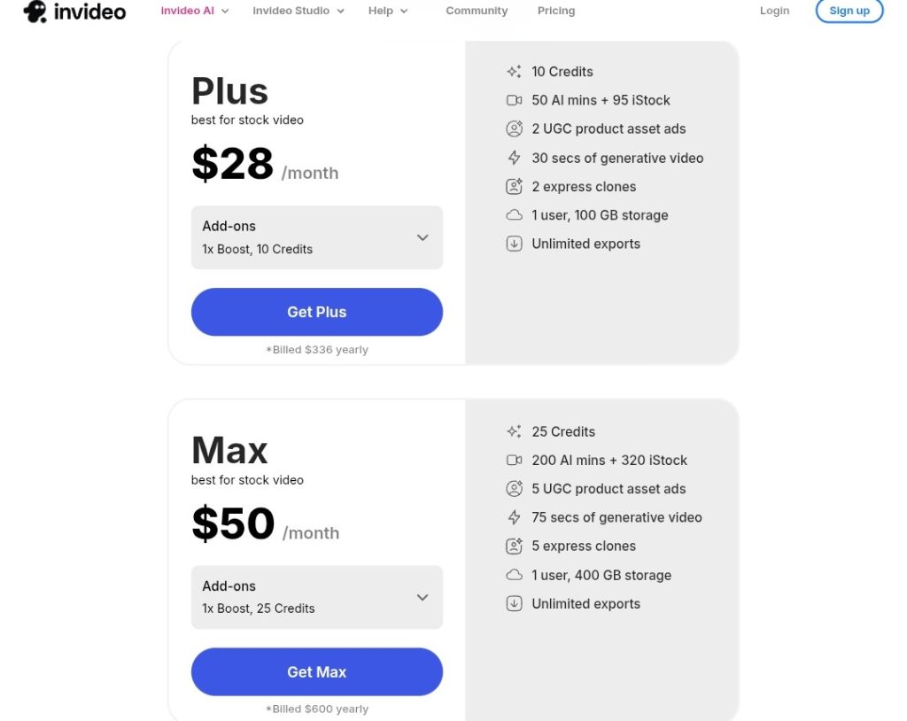 As of 2025, InVideo has also released AI content in the form of script-to-video, text-to-speech, and auto video creation. All of these features are included in the standard pricing plans, however, they each have restrictions on monthly use. If you have a larger requirement, you can purchase additional AI credits and even get custom pricing.