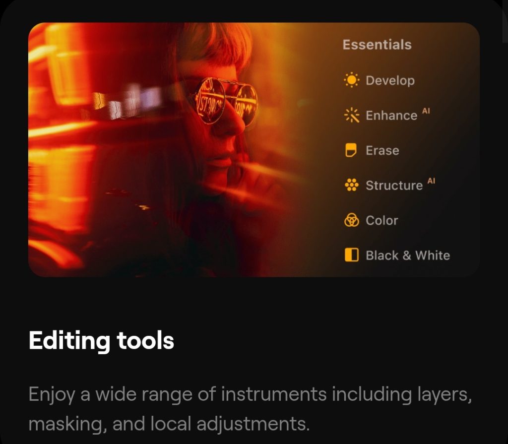 Enhance AI: a one-slider magic, it adjusts color, contrast, tone, and more.Structure AI: completes detail on a selective basis, establishing integrity in subjects – useful for landscapes.